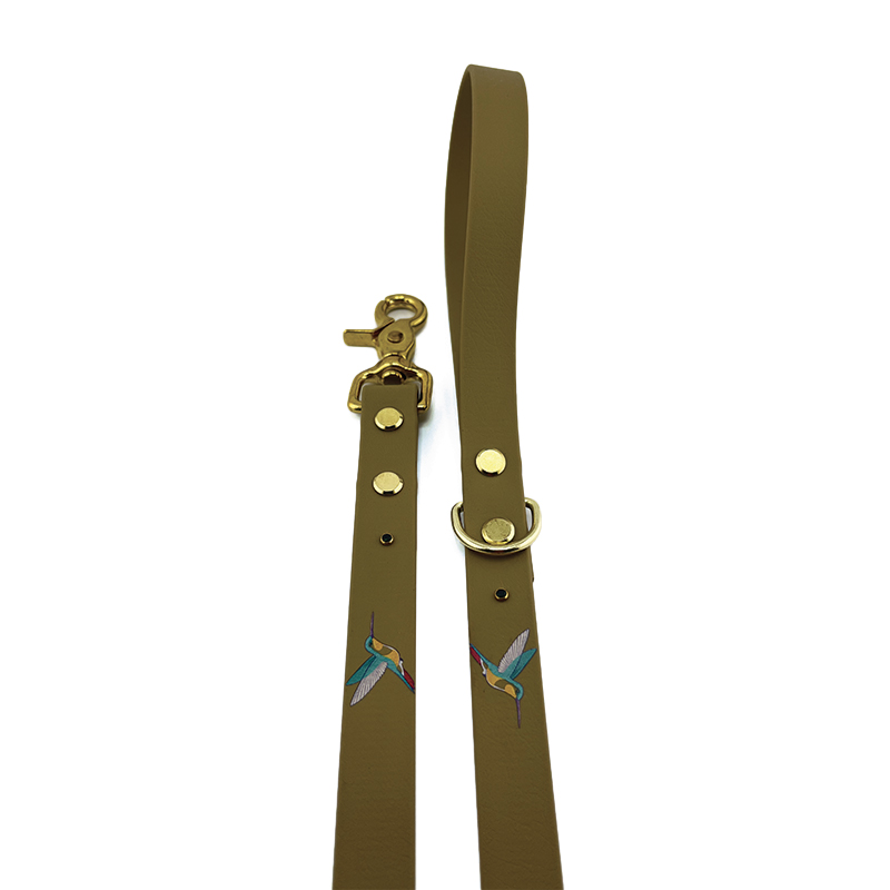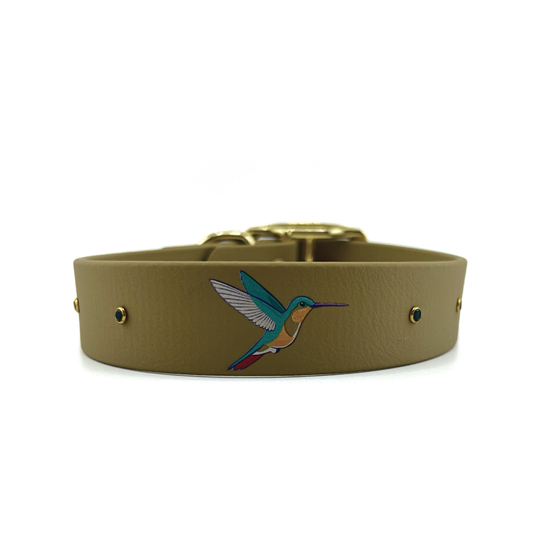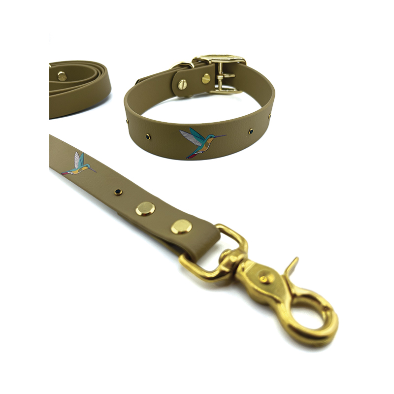 Cet ensemble associe un collier et une laisse assortis en biothane premium, décorés d’un colibri coloré aux ailes déployées et sublimés par des strass vert émeraude 💚. Un design unique, qui allie douceur et éclat pour des balades élégantes et poétiques.